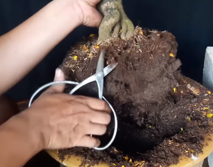 Cắt tỉa rễ bằng dụng cụ chuyên dụng tỉa bớt rễ già hoặc nhiễm nấm cho cây.